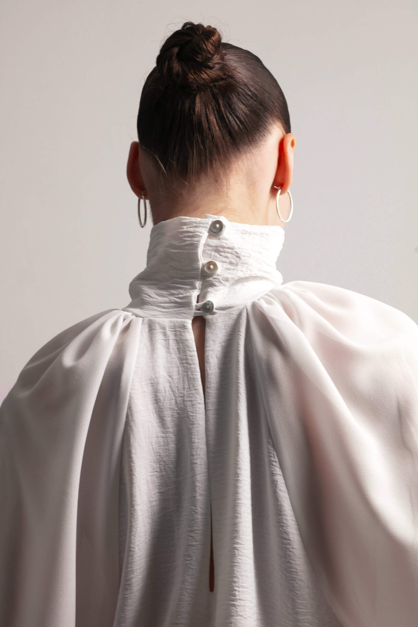 הכוללת צווארון גבוה מתוחכם עם כפתורי פנינה בעורף, המוסיפים מגע מעודן.