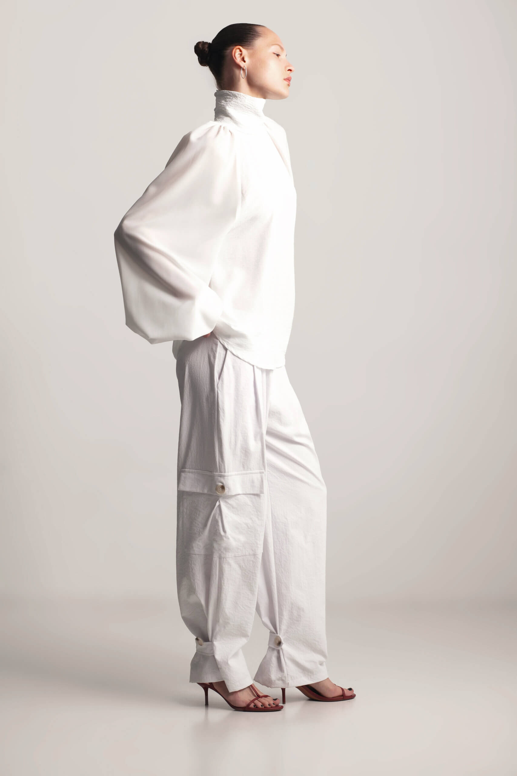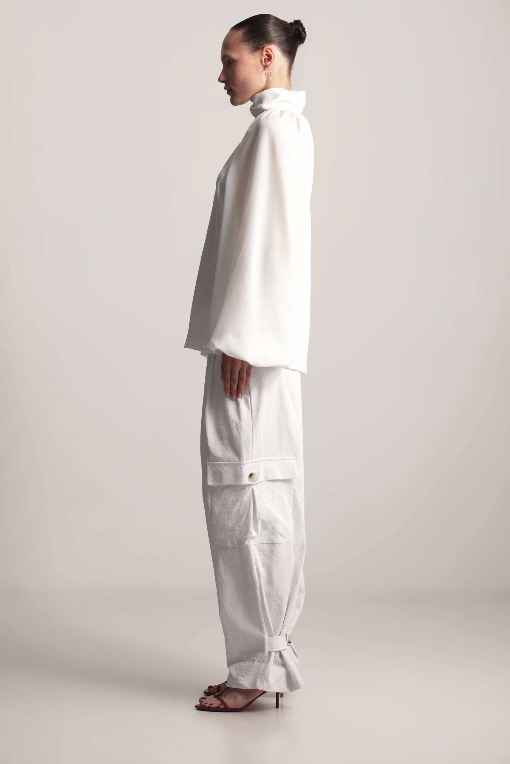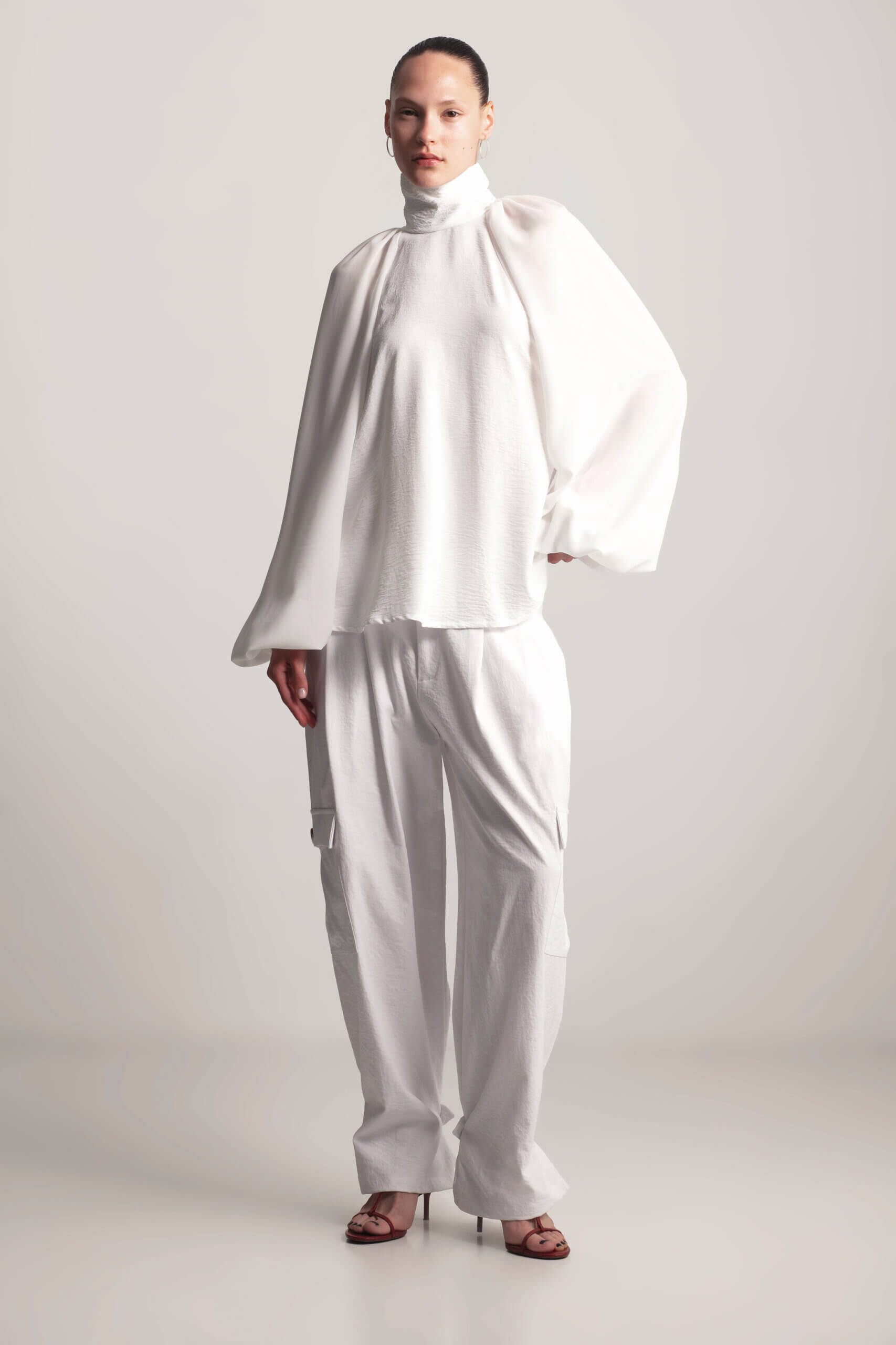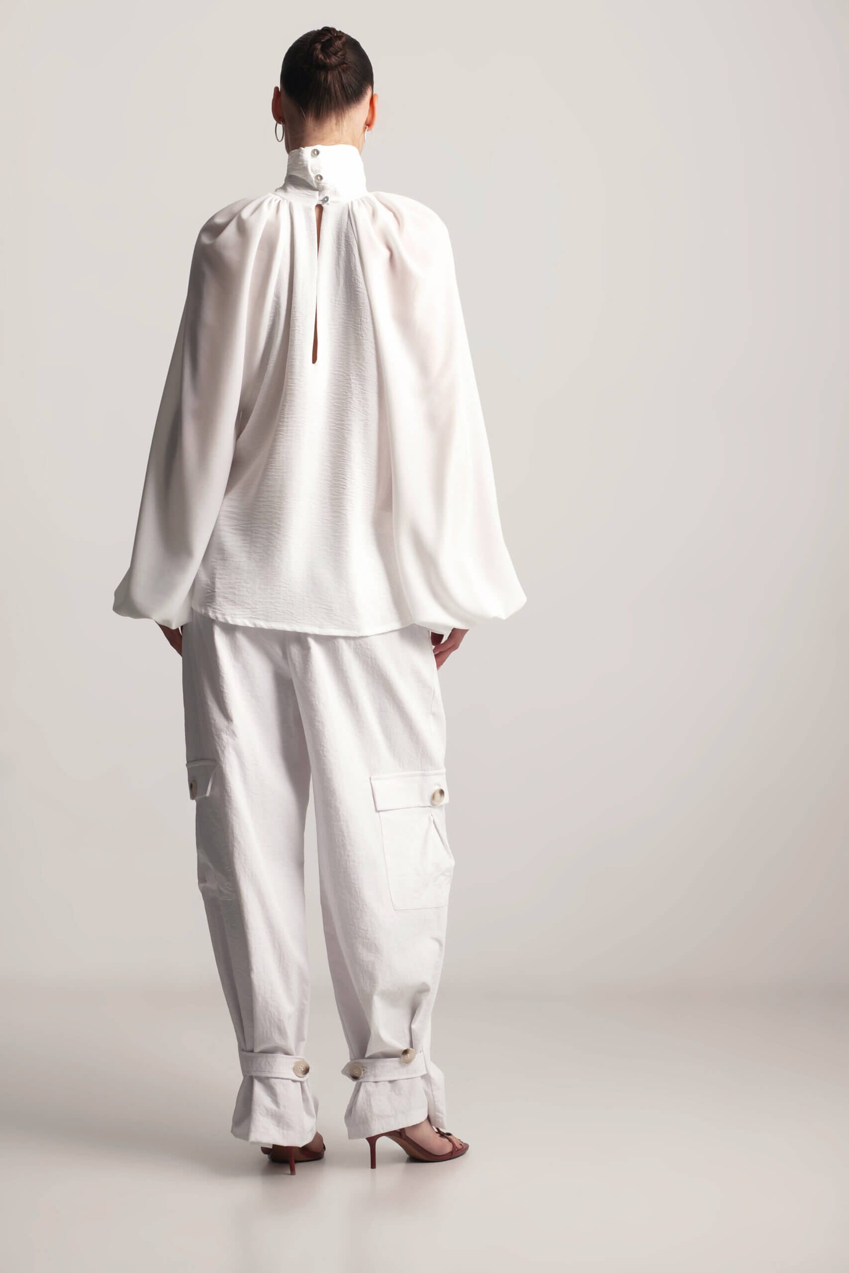 חולצה אלגנטית עם צווארון גבוה ושרוולים תפוחים,