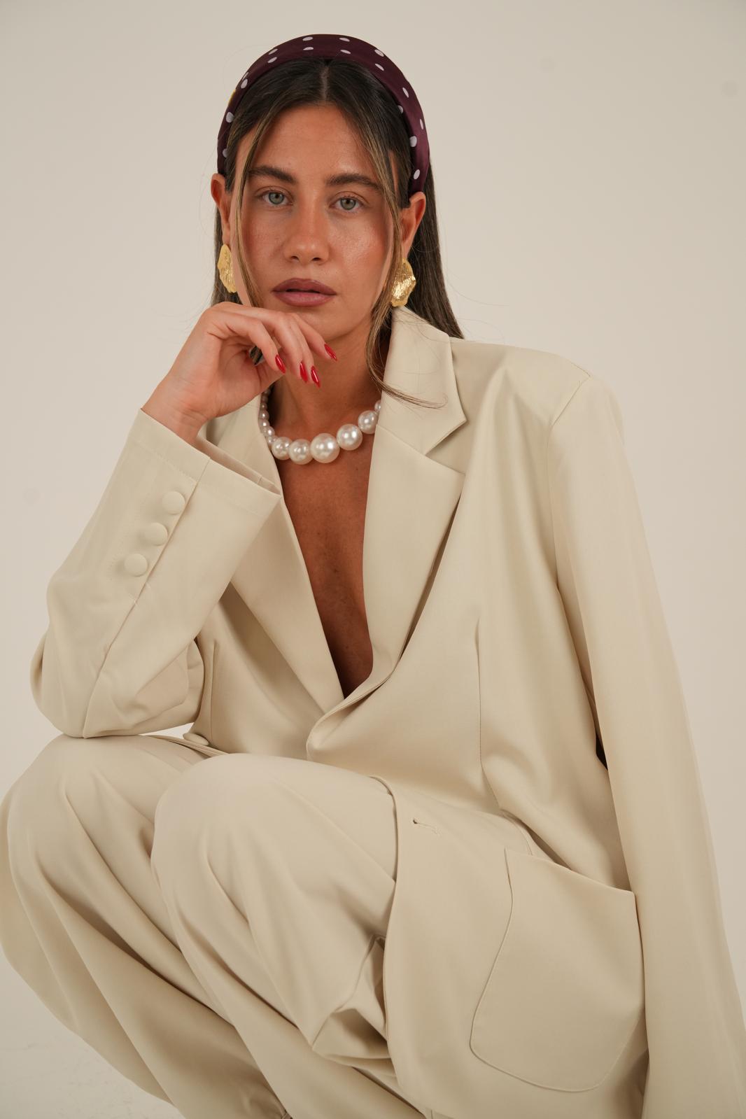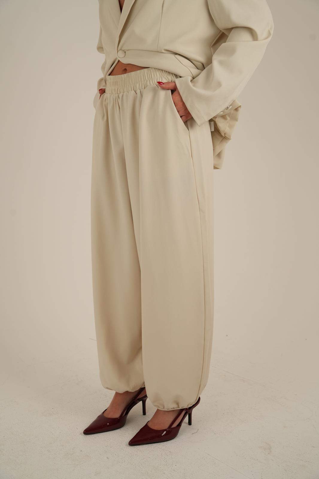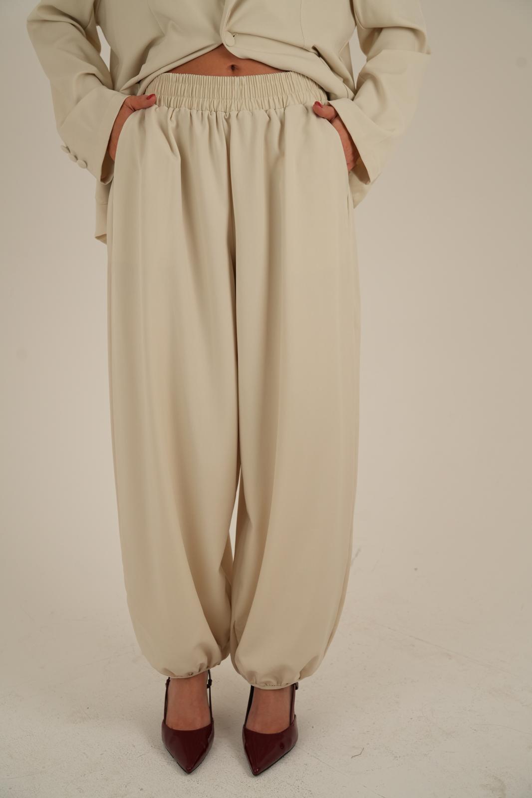 והמכנסיים עם גומי במותן ועם סגירה בקרסול ליצירת גזרת בלון.