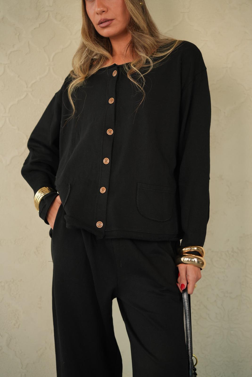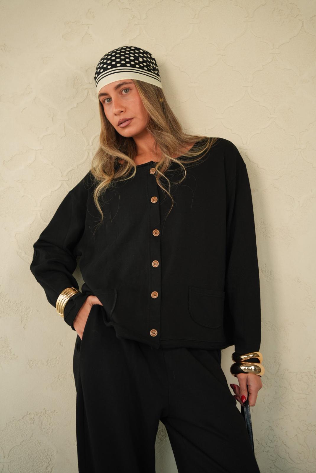 החולצה מכופתרת מעוצבת, עם כפתורי עץ