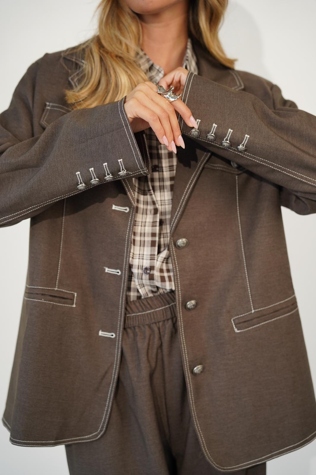 הג'קט עם תפרים מודגשים וכפתורים שמעטרים ועשירים את הג'קט.