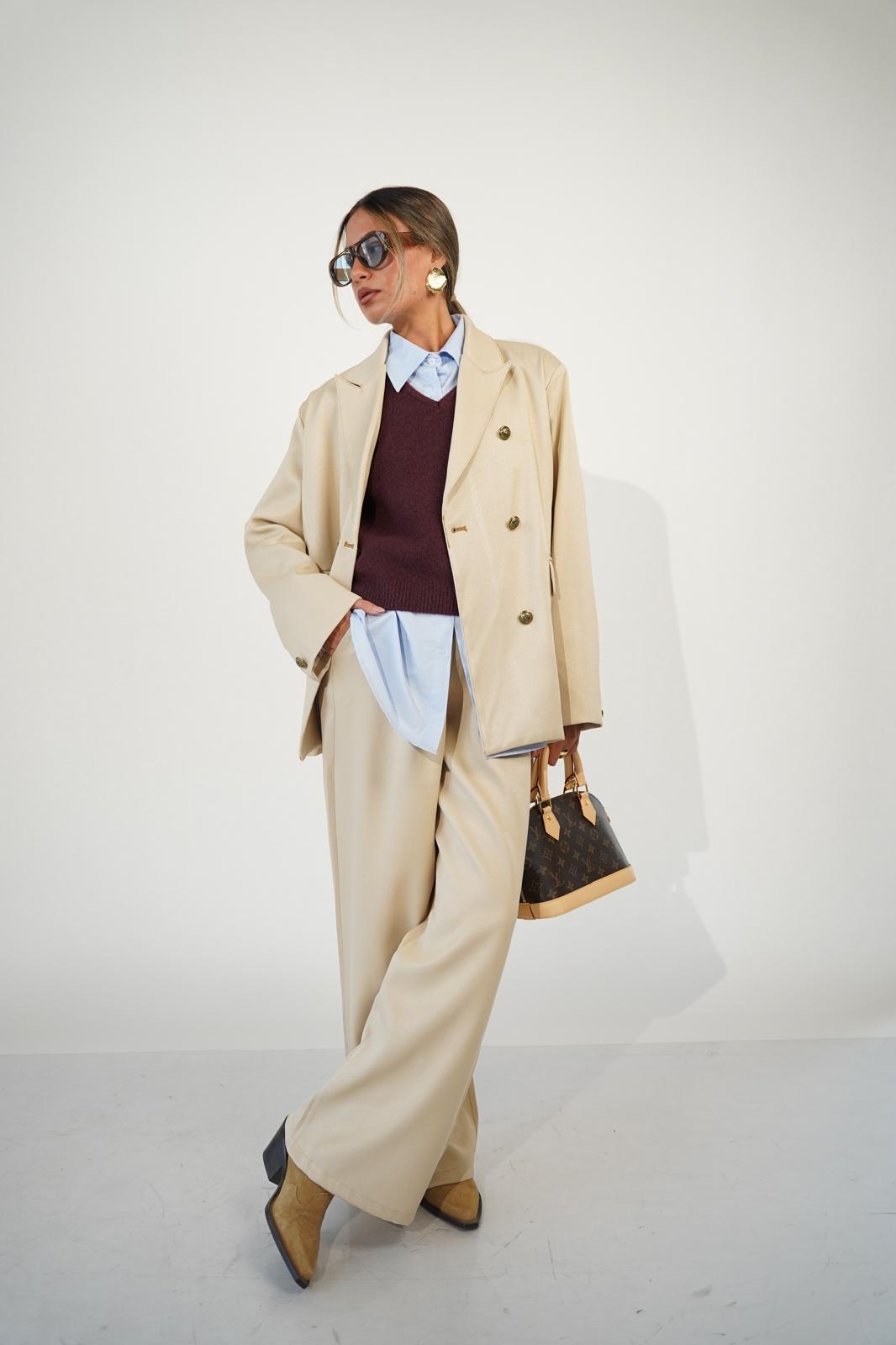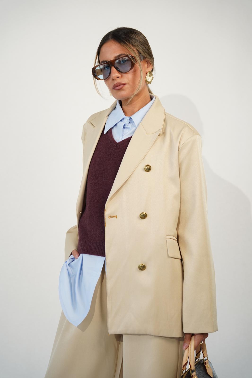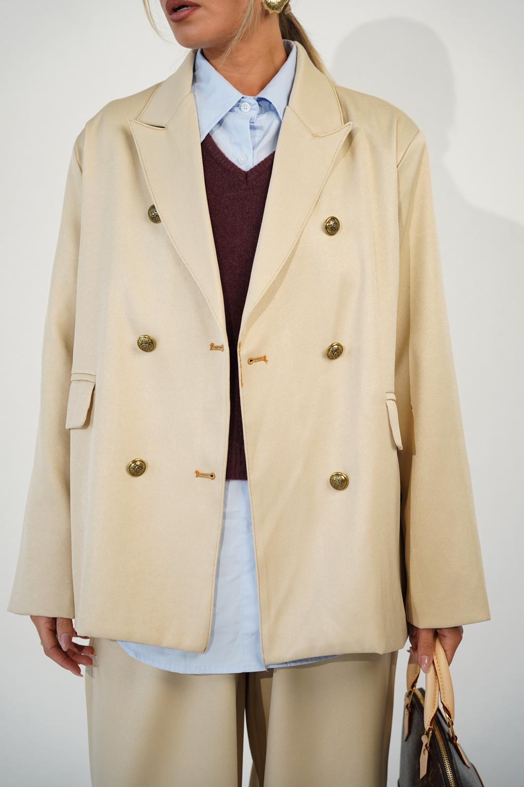 הג'קט עם תפרים מודגשים וכפתורים שמעטרים ועשירים את הג'קט.