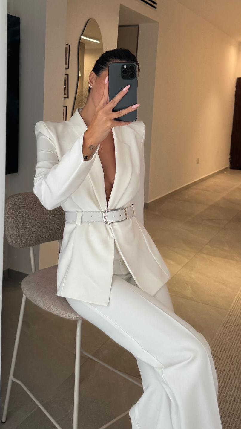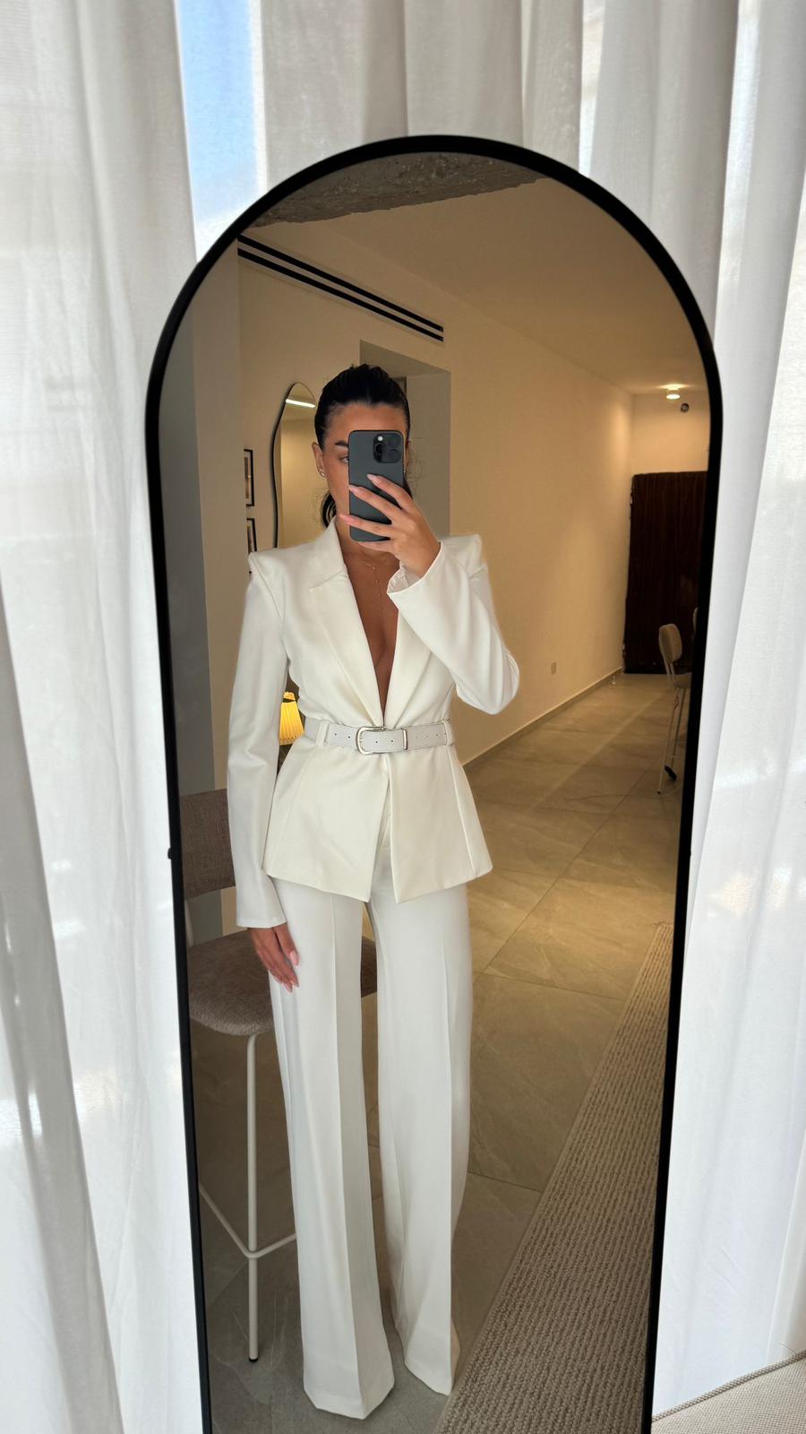 חליפת מכנסיים מחוייטת, אלגנטית ויוקרתית.